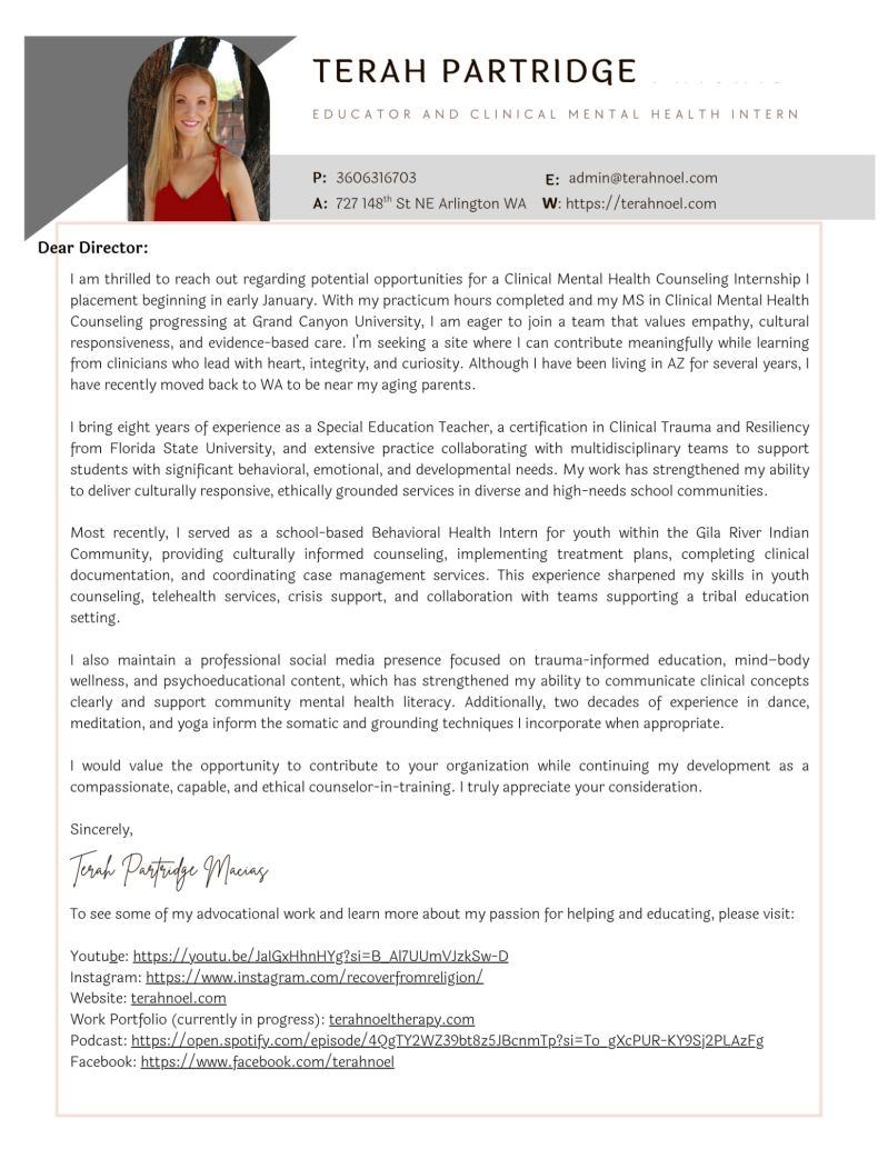 I am currently earning my MS in Clinical Mental Health from Grand Canyon University (expected: Spring 2026) and hope to expand my skills under the guidance of experienced and effective practitioners. I want to gain deeper insight into evidence-based interventions, assessment and treatment planning, and therapeutic techniques to support clients in ways that reflect your practice’s approach and philosophy. My passion for this work comes from personal experience as an abuse survivor, fueling my dedication to walking alongside others as they reclaim their sense of self and safety.